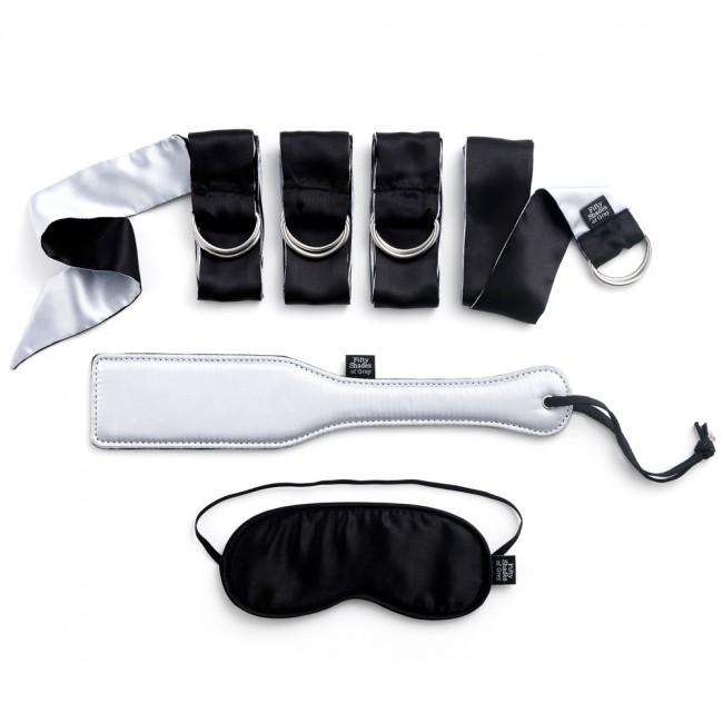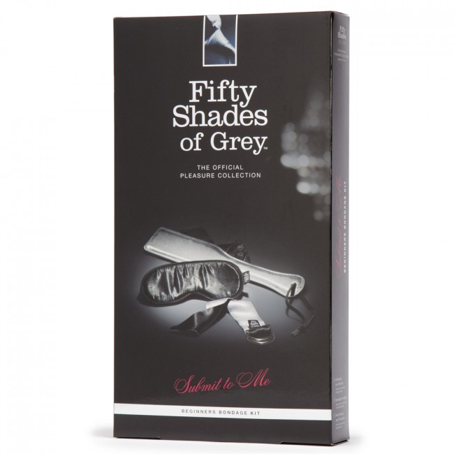 FSoG Submit To Me Beginners Bondage Kit. Official Fifty Shades of Grey Collection. Explore your Christian Grey and Anastasia Steele fantasies with the official Fifty Shades of Grey bedroom bondage gift set. 4 bondage restraints, a blindfold and a spanking paddle are included to take your erotic awakening from the page to the bedroom.