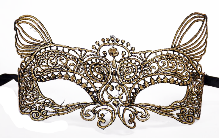 Sexy feline lace eye mask, with gold finish and stitched ribbon ties.