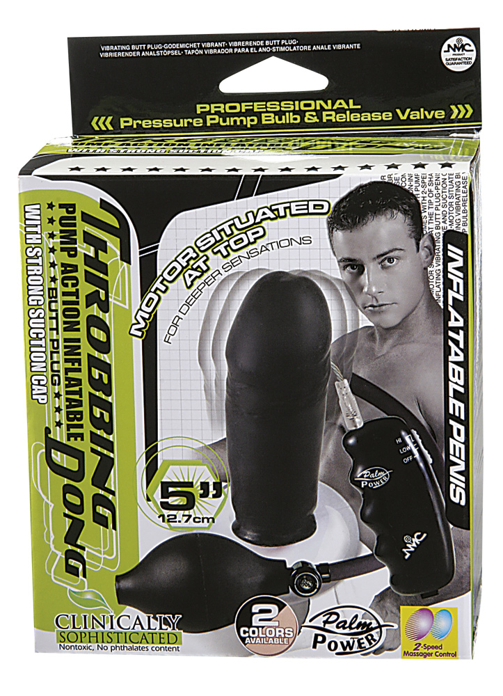 Throbbing Dong. Pump up your pleasure with the throbbing dong. This 5″ butt plug is made from Clinically Sophisticated Latex and not only has a stick to almost any surface suction cup at the base it has the wonderful capacity to be inflated via a bulb hand pump. Due to the super latex skin, this means it expands and relaxes for your individual pleasure, and if that wasn’t enough it has a multi-speed vibration motor right at the tip for extra stimulation. This product will leave you throbbing for more!! 2 x AA batteries