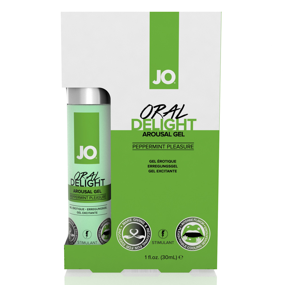 Jo Oral Delight Peppermint Pleasure Add a playful twist to giving and receiving with JO ORAL Delight. This gel offers a cooling sensation to enhance oral pleasure and delivers four delicious lip-smacking flavors. Enhances oral pleasure for both Cooling sensation invigorates and refreshes 4 delicious flavors: Strawberry Sensation, Cherry Burst, Vanilla Thrill and Peppermint Pleasure