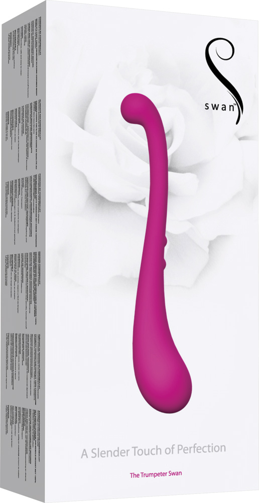 Swan – The Trumpeter. The Trumpeter Swan is the original design in the SWAN collection. Its long and flexible neck allows for an expansive variety of stimulation. Both ends are curved to tackle G-spot territory with grace and ease. The head and the bottom allow the Trumpeter to sweep through two currents and provide you with the most intense vibrations. The soft silicone body feels great on skin with smooth silicone-covered buttons to ensure safe usage. The Trumpeter is ready to fly in and out of your pleasure fantasy. Product SpecificationsDetails: Waterproof, Travel-Ready, Phthalate-freeDimensions: 25 cm x 2.5 cm (small end) x 4.3 cm (large end) Finish: 100% Seamless Silicone. Run Time: Up to 14 Hours. Charge Time: 3 Hours. Battery: Rechargeable Lithium-Ion. Motor: Dual motors powered by PowerBullet technology