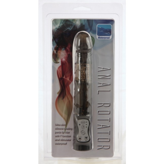 Dark Pleaser Dual Vibrator. A soft, 2 direction rotating penis headed shaft is coupled with a 7 mode beaded anal stimulator. A soft touch control panelled base, with bright red indicator lights for night control. This toy is sure to be top of the ass. 3 x AAA batteries
