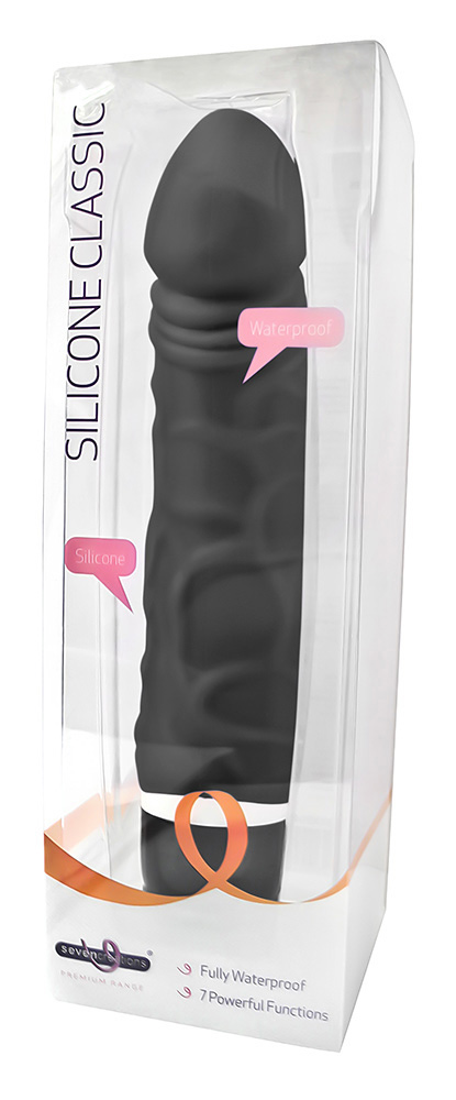 Silicone Classic Vibe Black. SILICONE CLASSIC. Our brand new range of vibrators take classic designs and bring them right up to date by casting them in silicone and setting them in very contemporary packaging. Three designs, three colours, three sizes AND seven powerful vibration features!! Each vibe is also fully waterproof. They are classic for a reason. This classic vibe is 6.5″ long and has realistic veined detailing. The shaft is slightly thicker for a more intense ride and it comes in three colours: Black, Flesh, Purple.