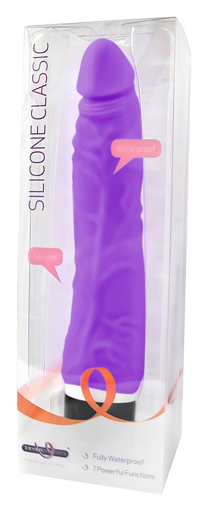 Silicone Classic Vibe Slim Purple. SILICONE CLASSIC. Our brand new range of vibrators take classic designs and bring them right up to date by casting them in silicone and setting them in very contemporary packaging. Three designs, three colours, three sizes AND seven powerful vibration features!! Each vibe is also fully waterproof. They are classic for a reason. The Classic Slim is a 7″ penis shaped vibe cast in high quality silicone. The shaft has realistic vein detailing and nice, slim shape with a slightly tapered head. It is available in three colours and boasts seven powerful vibration features. COLOURS Black, Flesh, Purple.